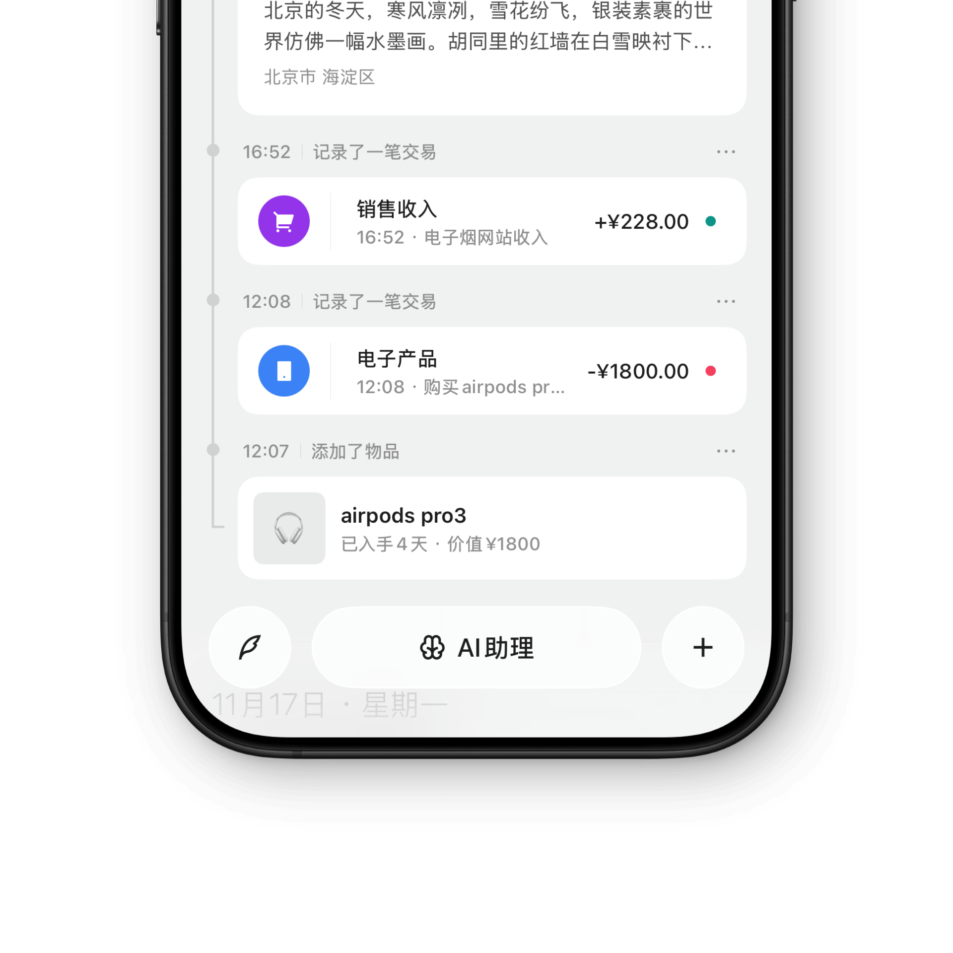 你所有的记录——收支、笔记、待办、纪念日——都将汇聚于一条优雅的时间线。 轻松回顾过往,追踪重要事件,让你的生活井井有条,每个重要时刻都有迹可循。